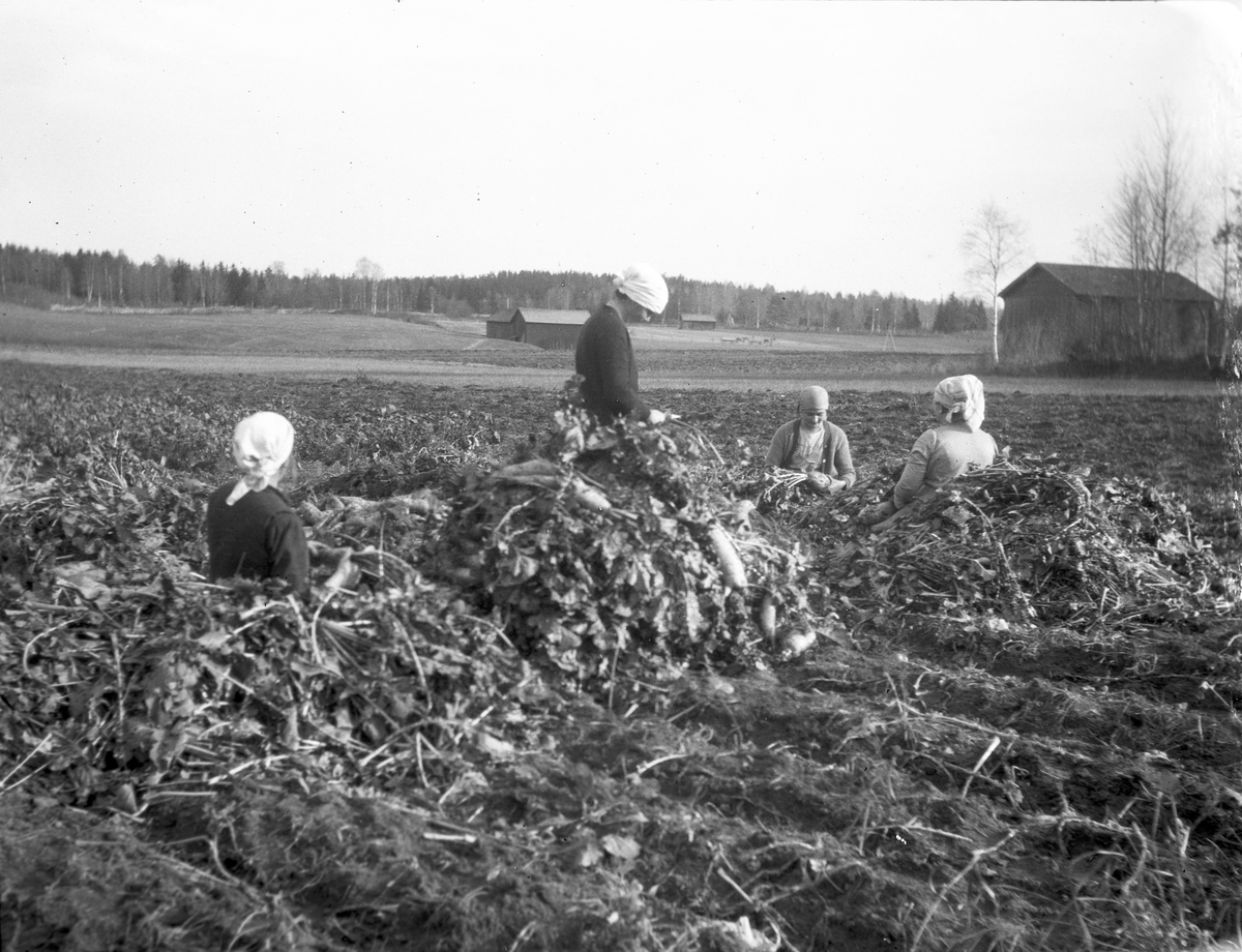 Rovorna är upptagna och skall blastas av. Från vänster Elin Jönsson, Klara Lind, Britta Alm och Anna Hansson. Bilden är tagen på åkern norr om gården på Åsmundshyttan nummer 9 "Erik-Anders".