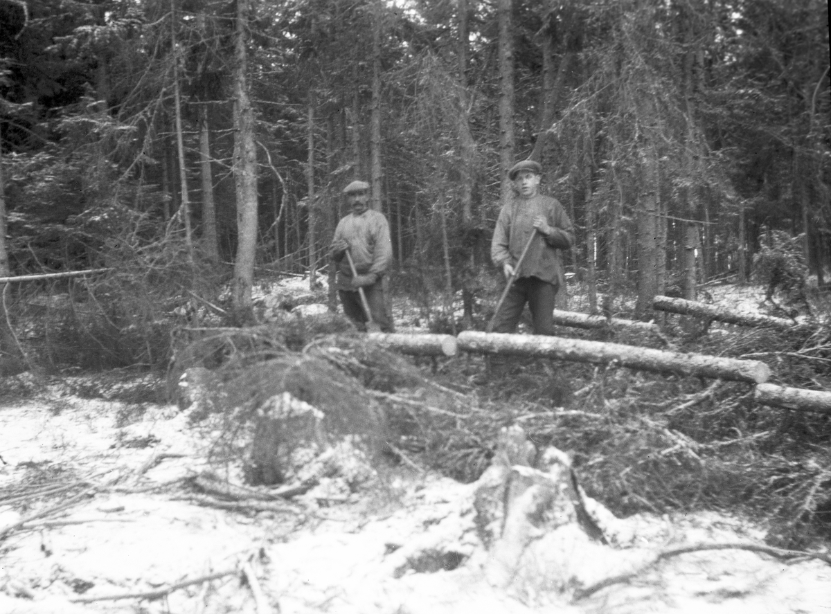 Den stormfällda skog på Åsmundshyttan nr. 9 "Erik Anders" skifte uppe vid Skessen huggs upp för vidare transport av Wilhelm Alm född 1875, och sonen Sune född 1916, utför arbetet. Bilden finns med i Torsåkers Fotohistoriska Sällskap. Bild 5:4.