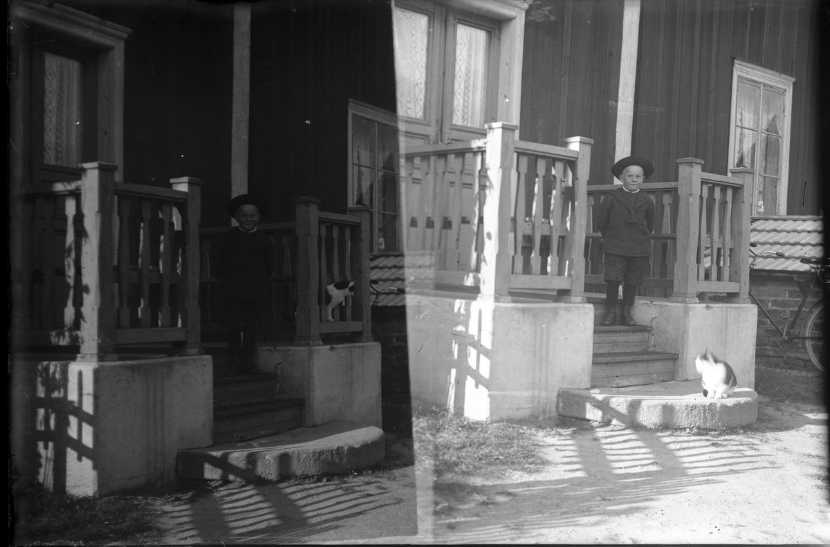 Pojke och katt på farstubron. Två bilder.