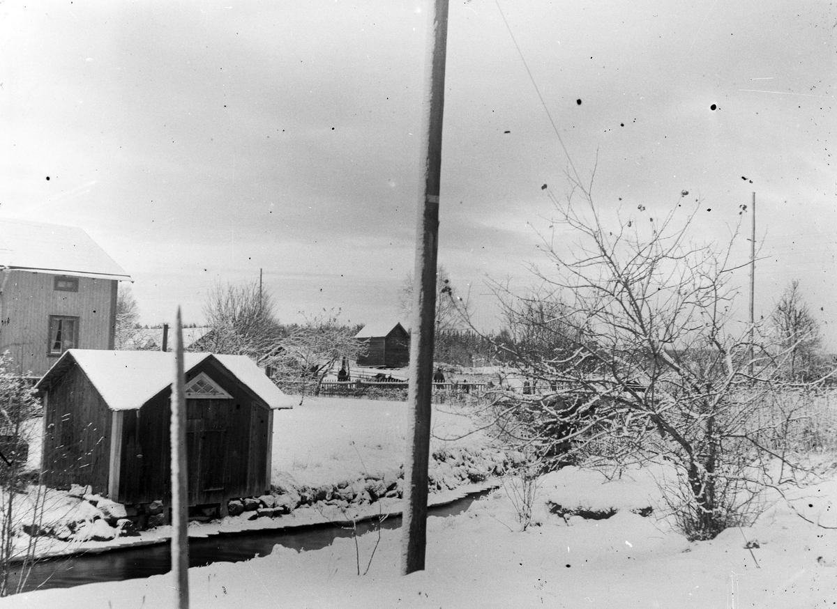 Ågrävningen har startat men har ej kommit upp och förstört vattenspegeln för Åsmundshyttan nummer 2 "Erkas". Nu är ån endast ett djup dike. "Erkas" lilla gård och tvättstuga till vänster och ett gammalt magasin i bakgrunden som revs 1950.