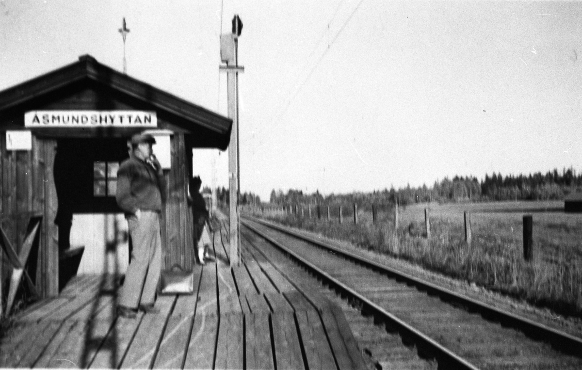 Joel vid anhalten. Åsmundshyttan. Här var det "Resande mot Krylbo tåg inkommer på spår fem", en av de resande är Joel Hansson. Bilden är tagen omkring 1935. Bilden finns med i Torsåkers Fotohistoriska Sällskap. Bild 4:4.