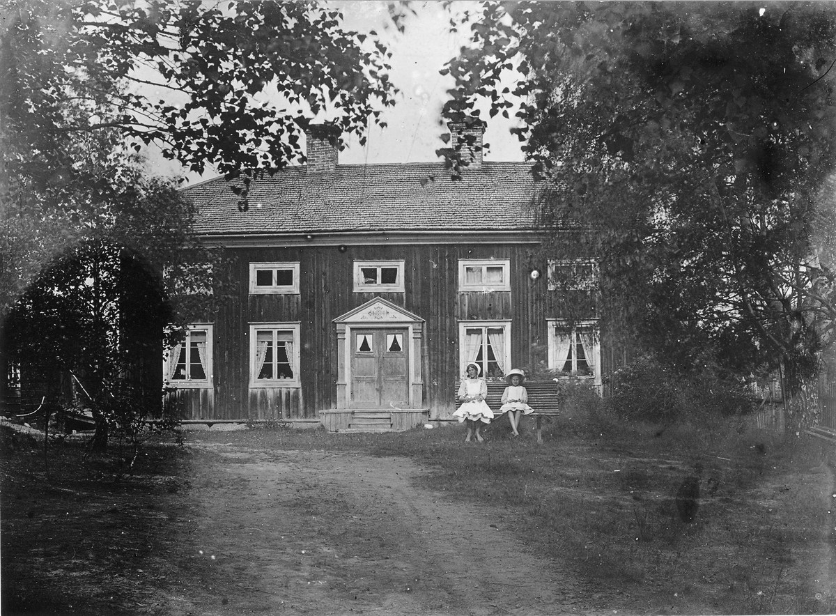 Fotografen Lindbergs hem på "Berget" i Östansjö. På bänken sitter Per Lindbergs döttrar, Ester, född 20 mars 1897, död 15 juli 1955 och Elvira, född 10 juni 1900, död 12 januari 1981.
