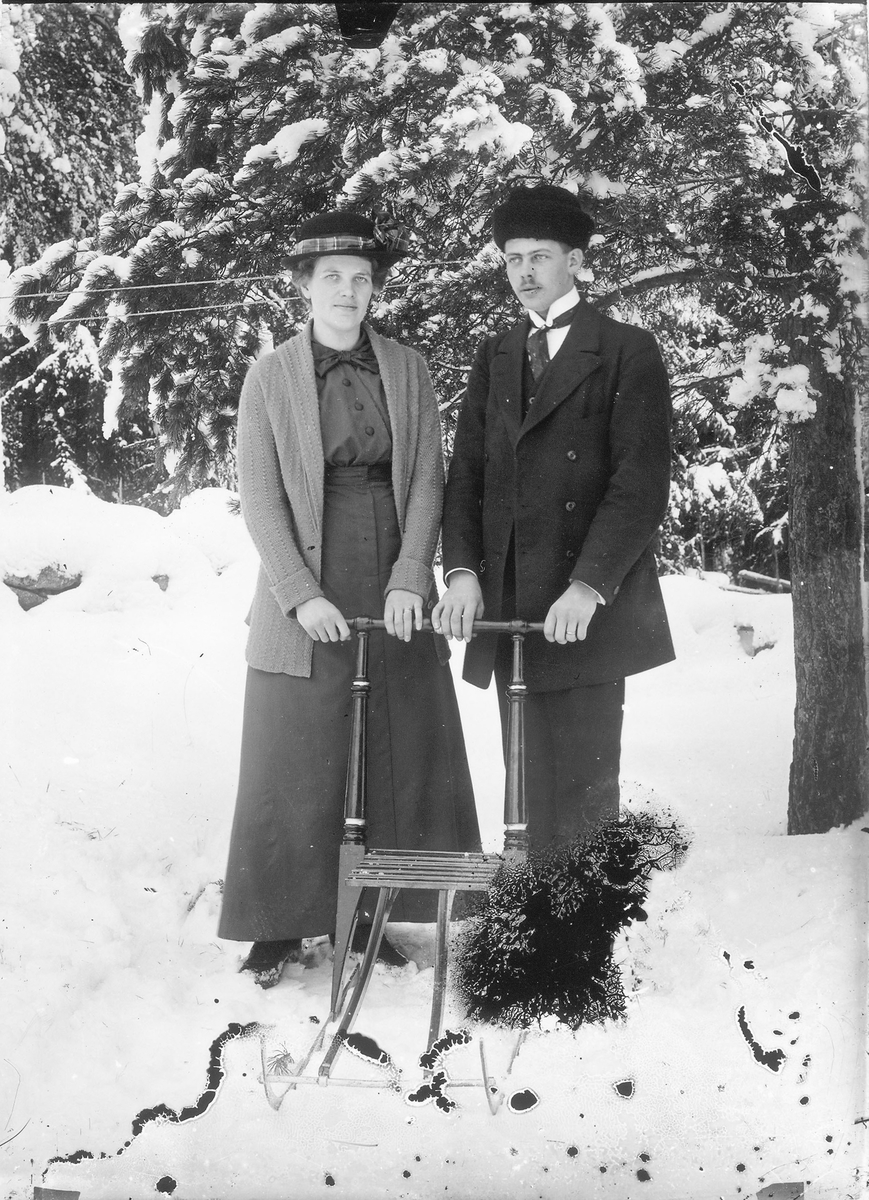 Anna och Per Herman Lindberg, Hällbo. Barn: Gunborg, född 1915 och Bernt, född 1923. Kortet är taget på "Berget" i Östansjö.