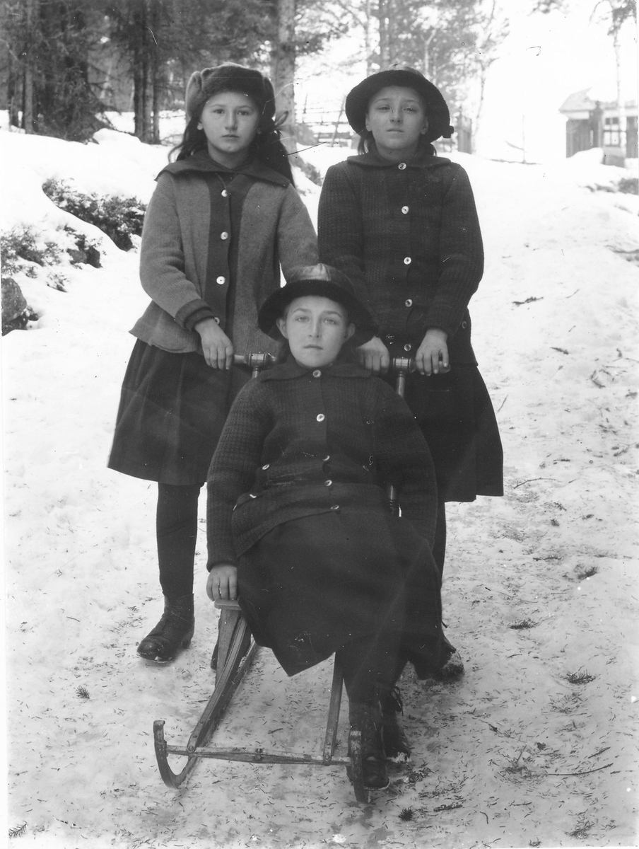 Bilden tagen nedanför fotografens hem i Östansjö. Flickan till vänster är Gerda Näslund, Herte och flickan till höger Anna Kroon, Herte. Flickan på sparken är Hilda Kroon, Herte.
