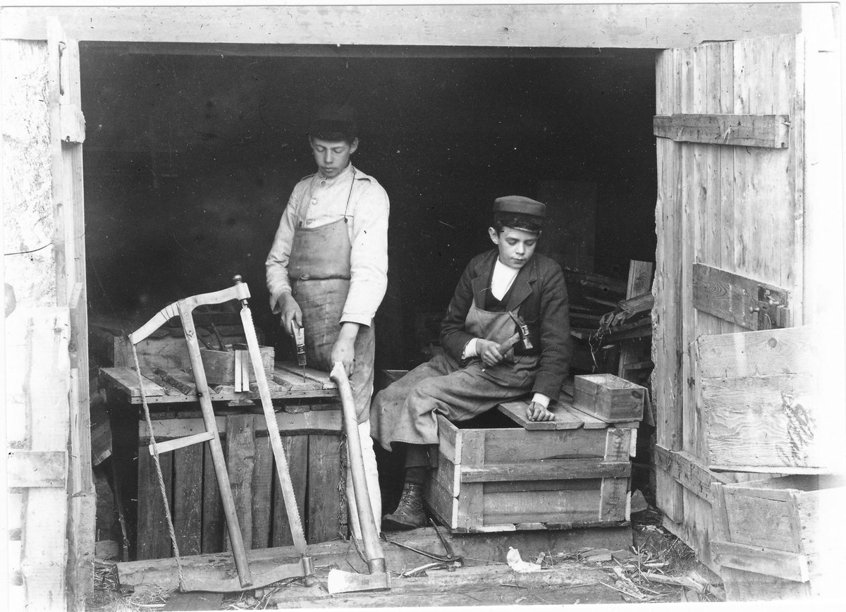 Snickarbestyr. Grabben till höger är Erik Jonsson, "Bageri-Erik", Håbacken. Grabben till vänster är Per H Lindberg (fotografens son).