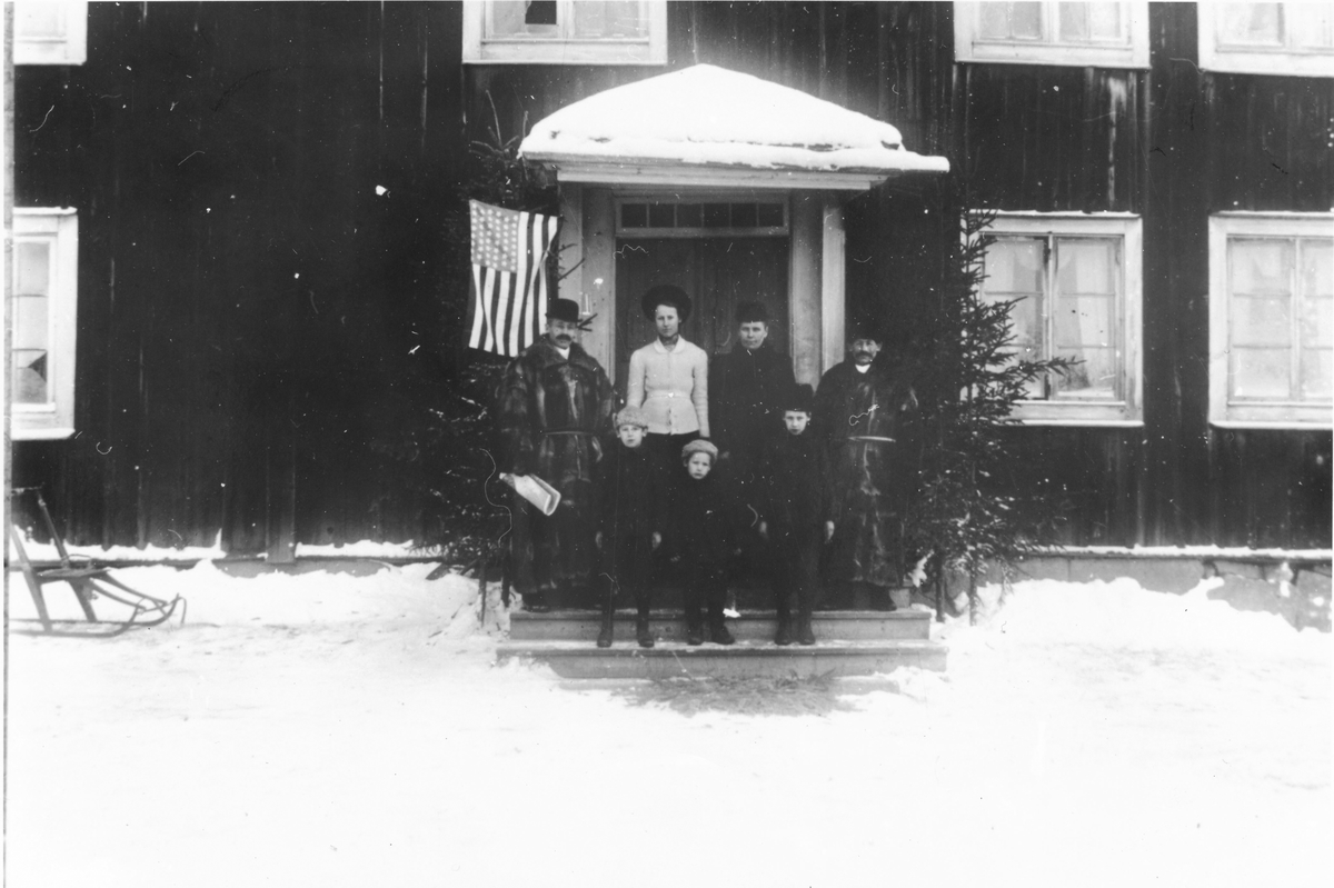Gården kan vara "Storåkers" i Hå. Mannen till vänster på bron är son i gården, Anders Ryjtermark. Han reste över till Amerika i unga år. Mannen till höger är troligen en bror till Anders, Jonas och hans familj som blev kvar på gården. En syster till bröderna, Marta, blev gift med Nils Andersson och flyttade till "Kvarnåkers" i Hällbo. De fick några barn tillsammans innan Marta dog i barnsäng när hon fick dottern Elsa, född 1912. När Elsa var 16-17 år fick hon åka till Amerika och stanna hos morbror Anders och moster Lydia eftersom dom var barnlösa. Hon blev sedan kvar i Amerika. Även hon dog i barnsäng, 1937.