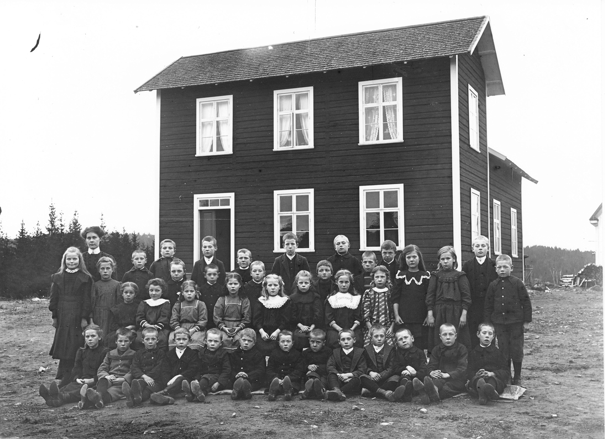 Lärarinnan Olga Gustavsson. Nr 2, tredje raden är Marta Hansson, "Högvalls-Marta" och nr 5, samma rad är Helga Käller. Övriga personer okända.