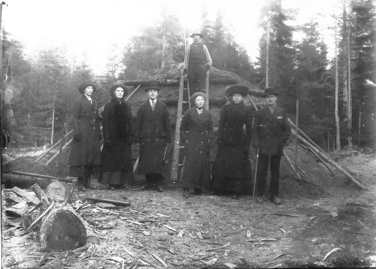 Kolaren Lars Eriksson, "Lilllbo-Lars" på stegen. Övriga personer från vänster: Ester Lindberg, Anna Käller, Per Herman Lindberg, Elvira Lindberg, två okända personer längst till höger.