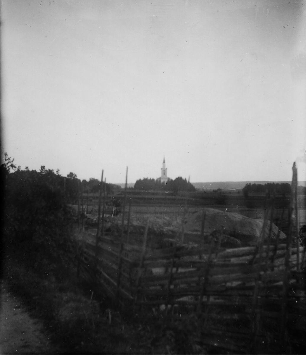 Vy över Hamrånge med kyrkan i mitten av bilden.