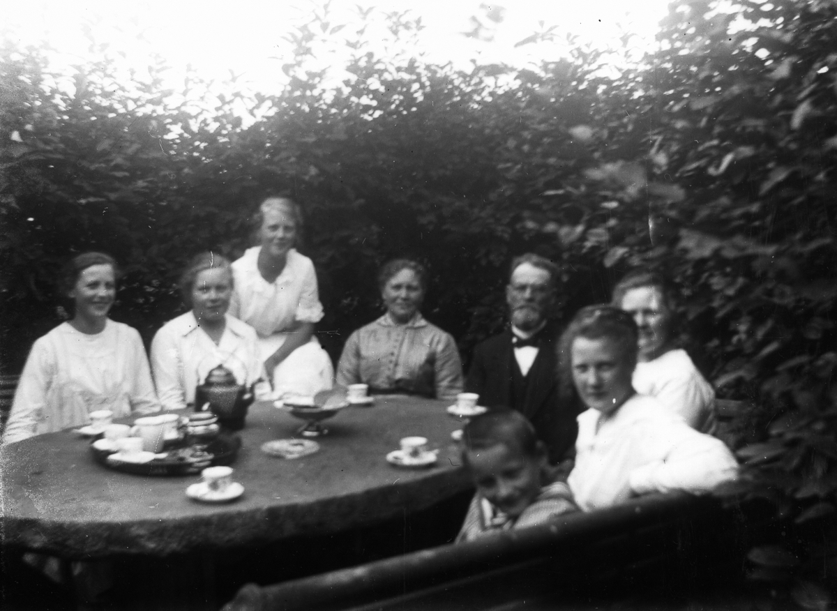 Originaltext: Vid stenbordet i bersån på Hedvigslund något av de år Sverige tog emot tyska barn eftersom Martin Wriedt är med.