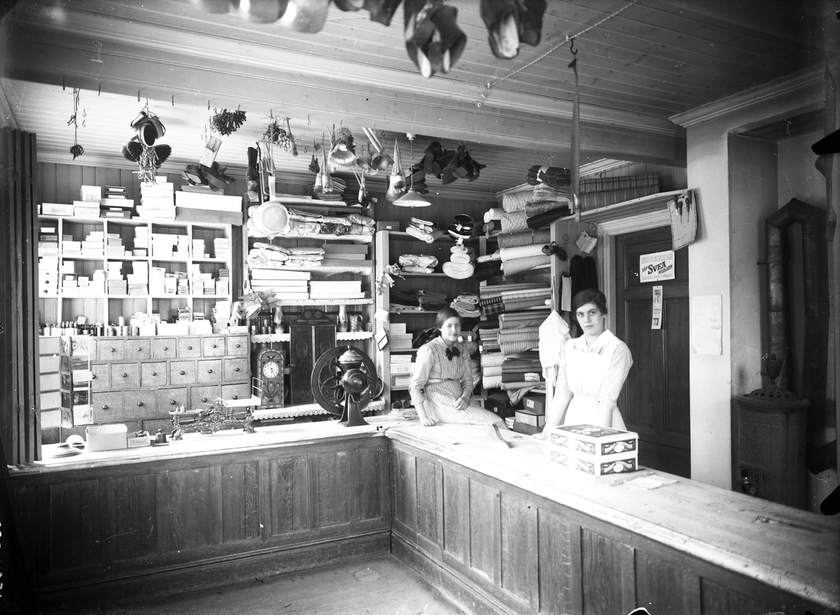 Interiörbild från Konsum, Bergby. Från vänster Hulda Åbom-Silén, och Elsa Enström, gift Lingman.