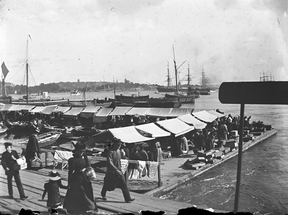 Marknadsstånd vid hamn.