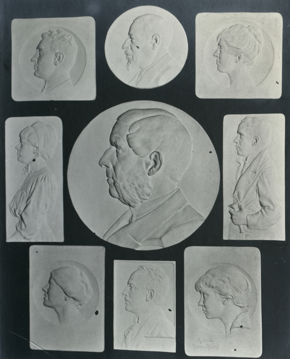 Skulpturer av John Runer. Ingenjör Paul Toll, Ingejör A. Kullberg och Fru Gunhild Toll 1916. Syster Karin och Konsul Carl Runer 1916. Doktor E. Kylin 1917. Fru Stina Kylin 1915. Doktor J. Leffler 1918. Fröken Astrid Heap- Åberg 1915.