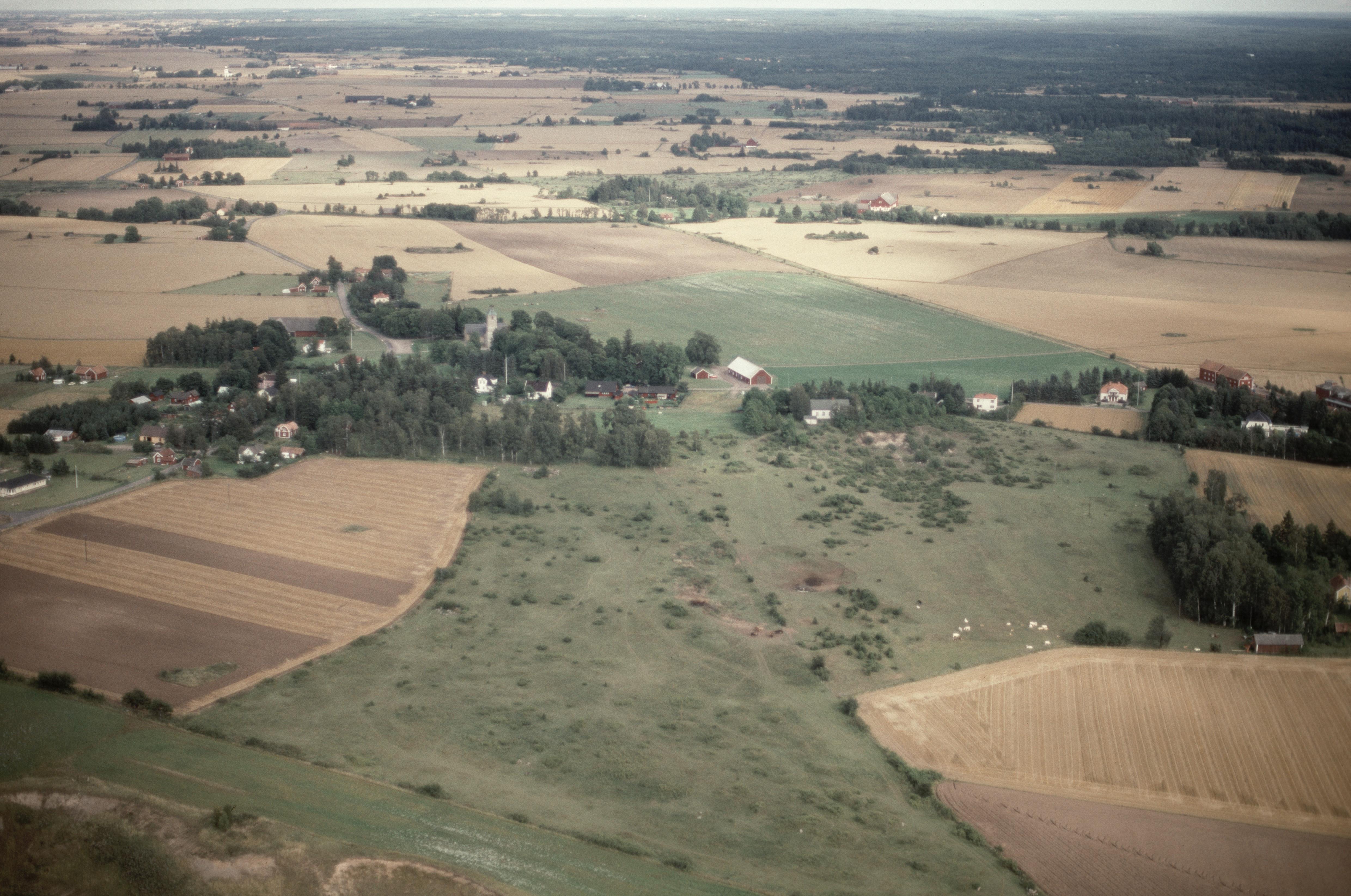 I bildens nedre del gravfält Jussbergs kulle RAÄnr Heda 20:1. Vid bildens mitt Heda kyrka. Bilden är tagen mot (väderstreck): OSO