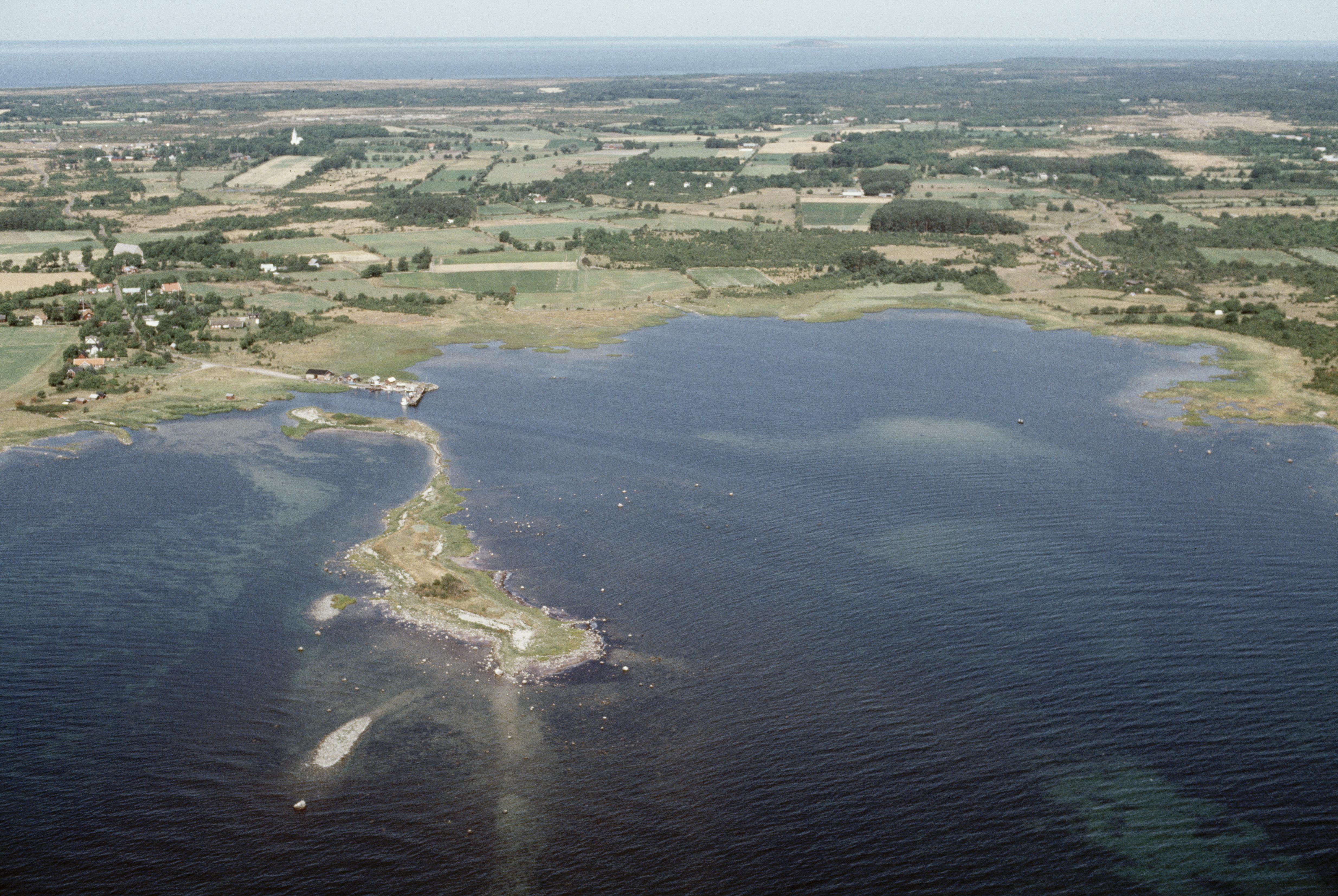 Fiskehamnen Källahamn. I bildens övre del till vänster Källa gamla kyrka. Bilden är tagen mot (väderstreck): VNV