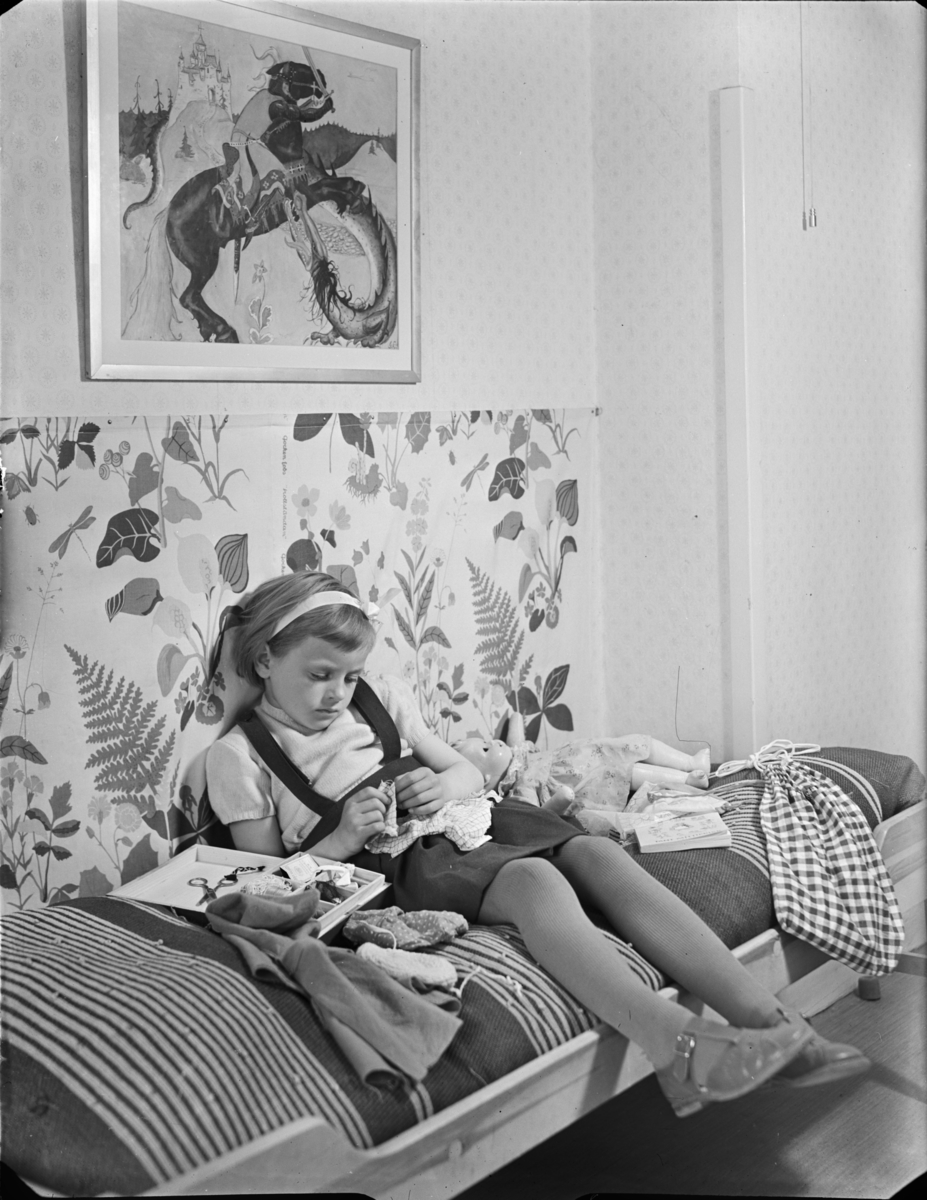 Flicka som halvligger i sin säng med leksaker omkring sig