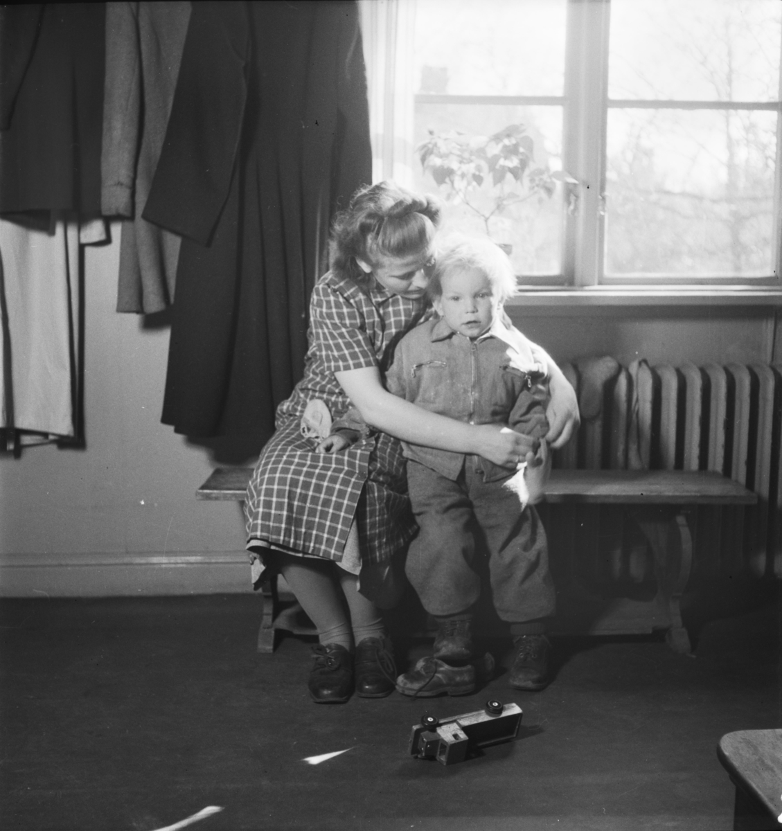 Titel: "Påklädning av en pojke", Djursholm Kvinna och pojke Interiör