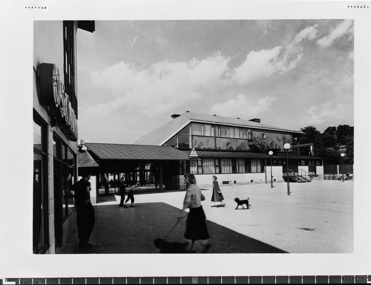 Exteriör. Vid torget, människor i förgrunden. Bibliotek.