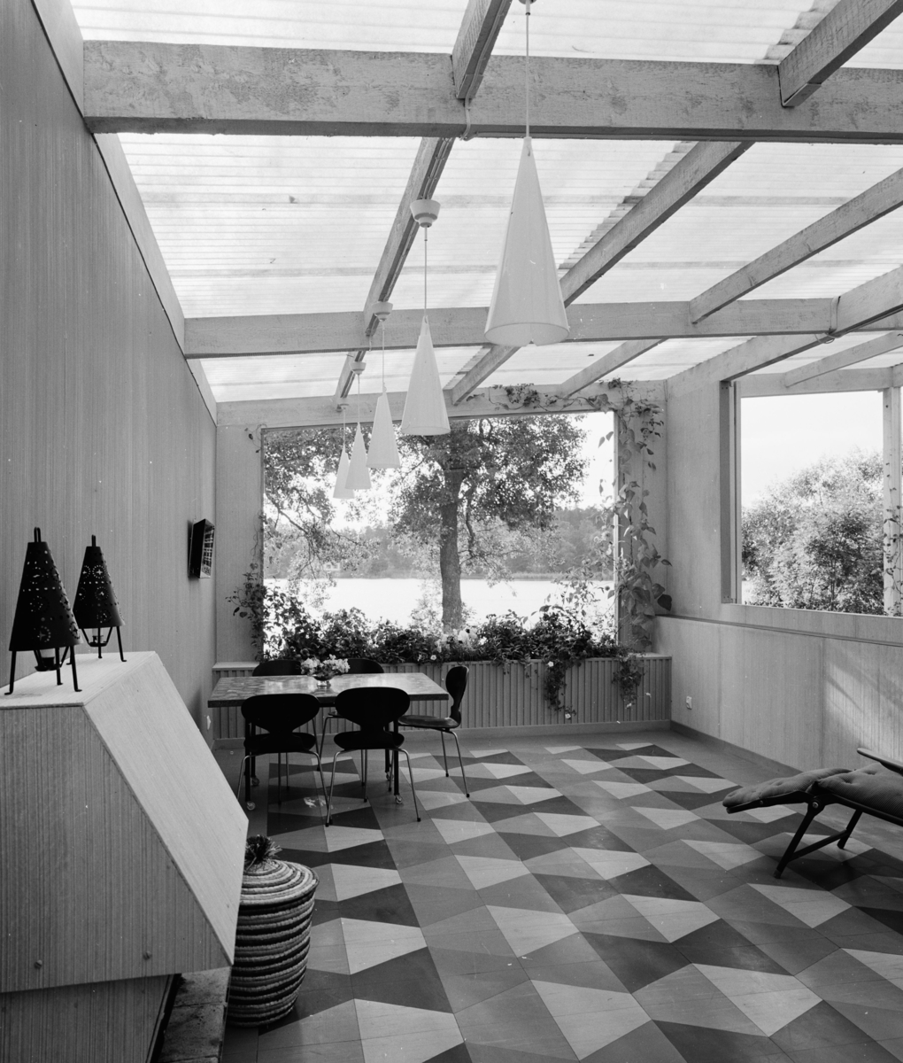 Rum med ljusinsläppande plasttak och mönstrat golv