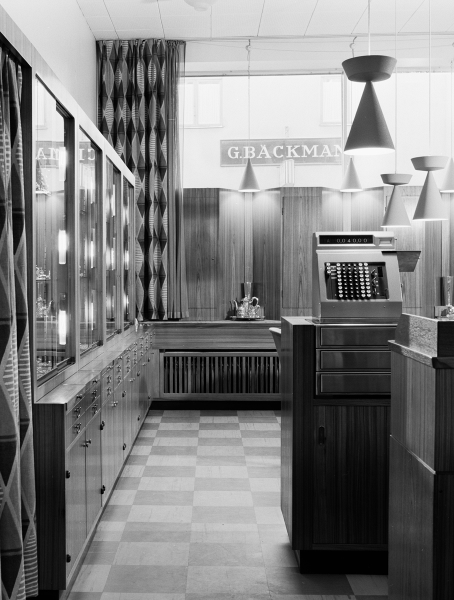 Butiksinteriör, skyltfönster med träskärm samt vitrinskåp för varor längs med väggen.