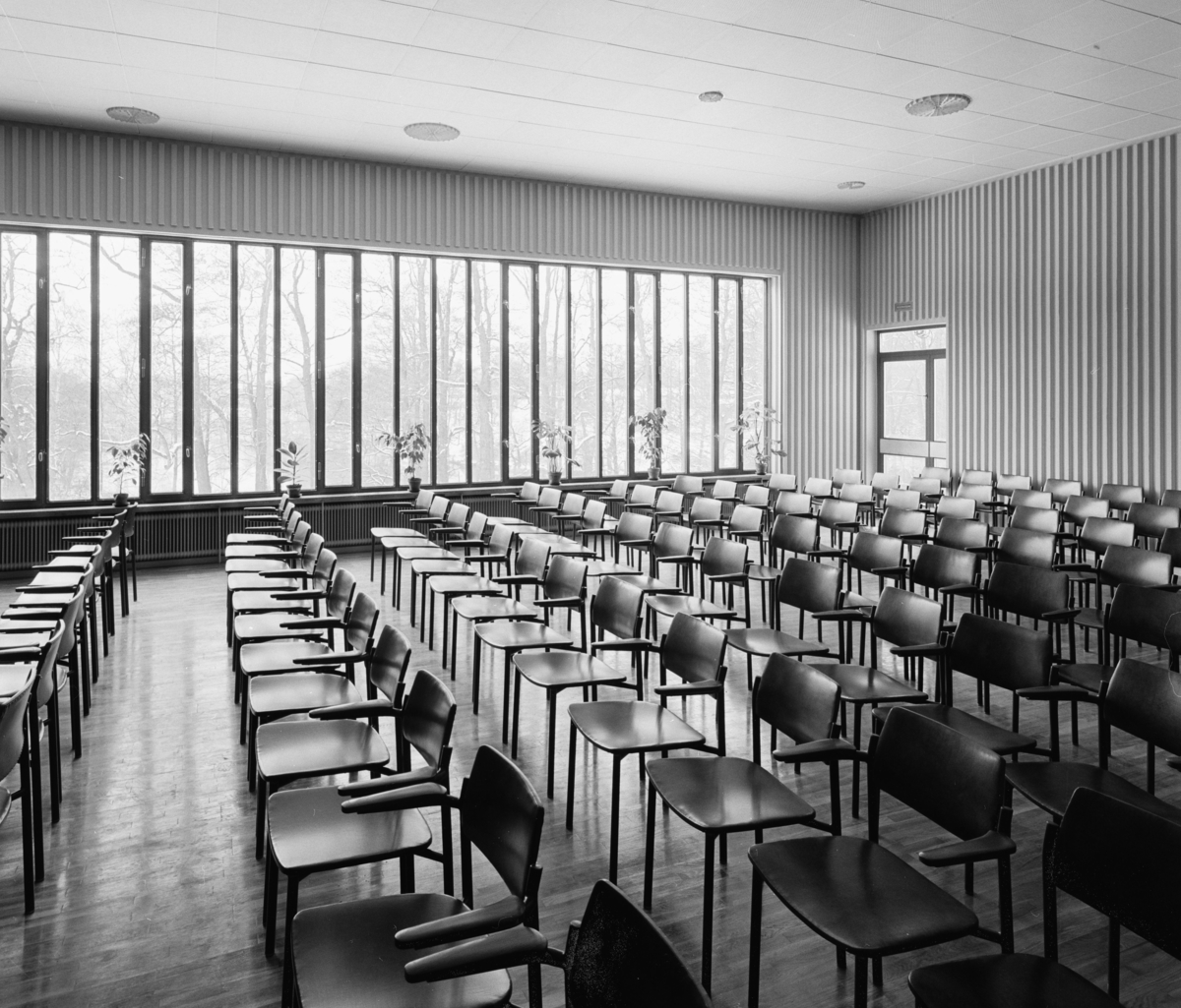 Interiör av samlingssal. Uppställda stolar i rader, i fonden uppglasad vägg.