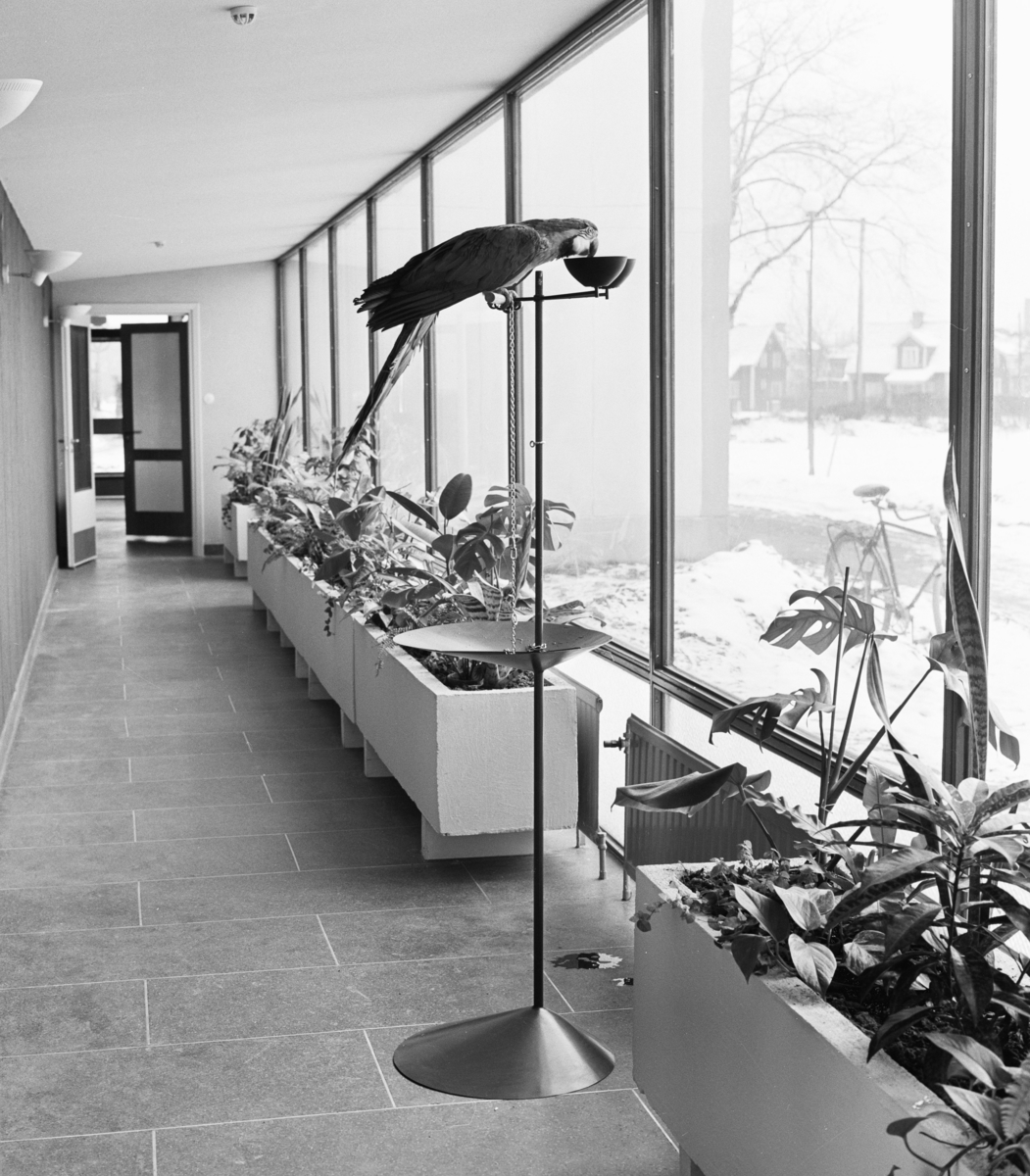 Interiör, förbindelsebyggnad med uppglasade väggar och gröna växter i blomlådor. Papegoja på stålställning med matskål.