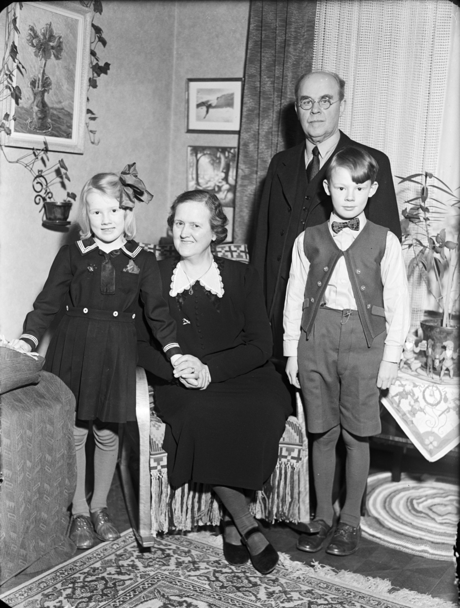 Titel: Reproduktion Gruppbild: Ett kvinna, en man och två barn, Gunilla och Stig. Interiör
