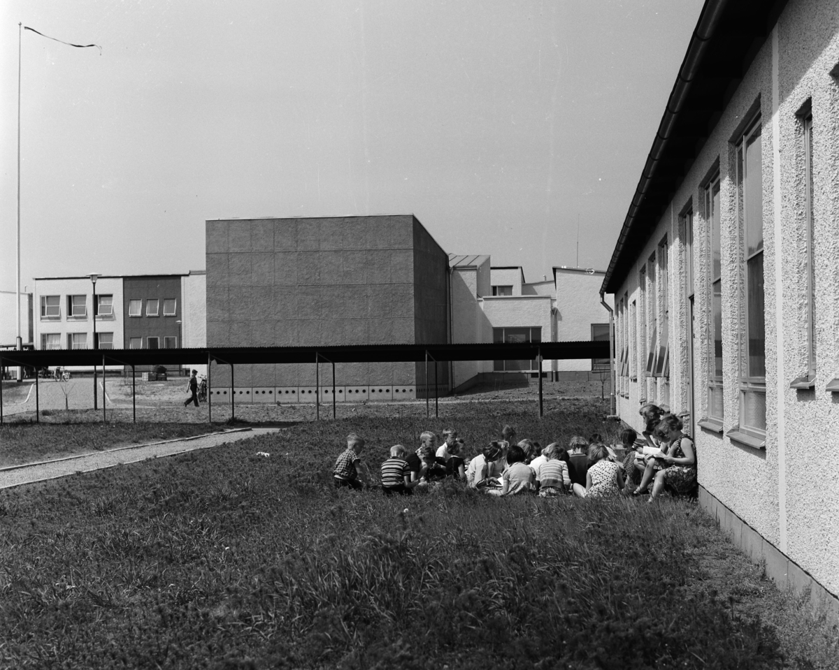 Titel: Ljuraskolan Exteriör, aulan och bespisningen sedda från småskolan