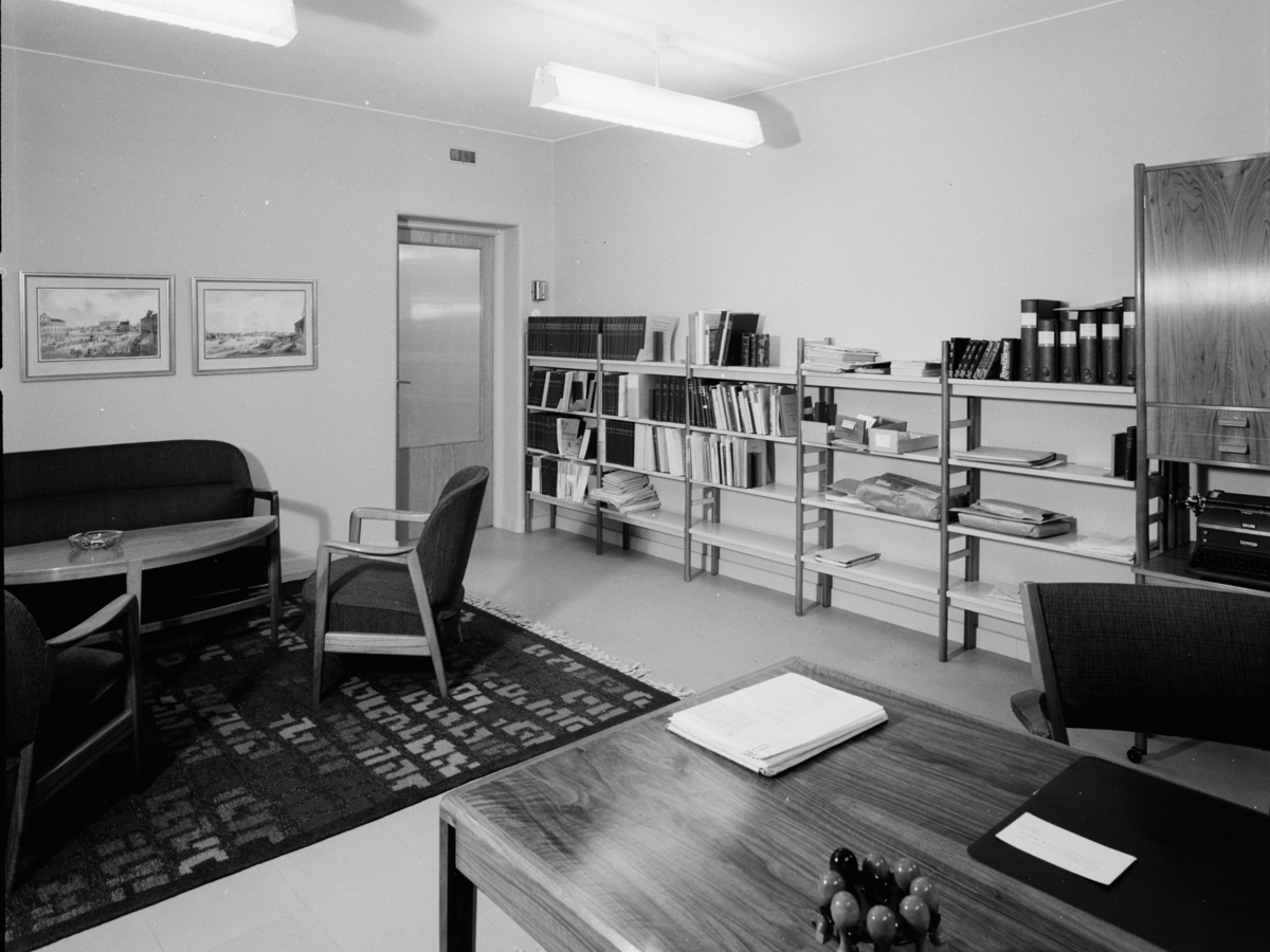 Interiör. Kontor med sittgrupp, skrivbord i förgrunden.