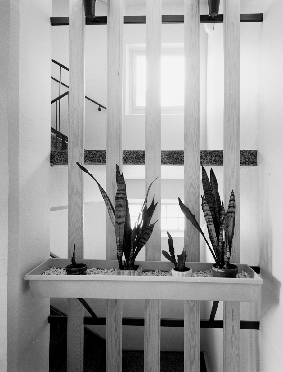 Interiör, detalj av spaljé i entréhallen mot trappa