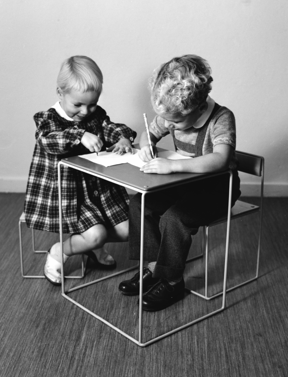 Flicka och pojke skrivandes vid ett satsbord med ben av rundjärn