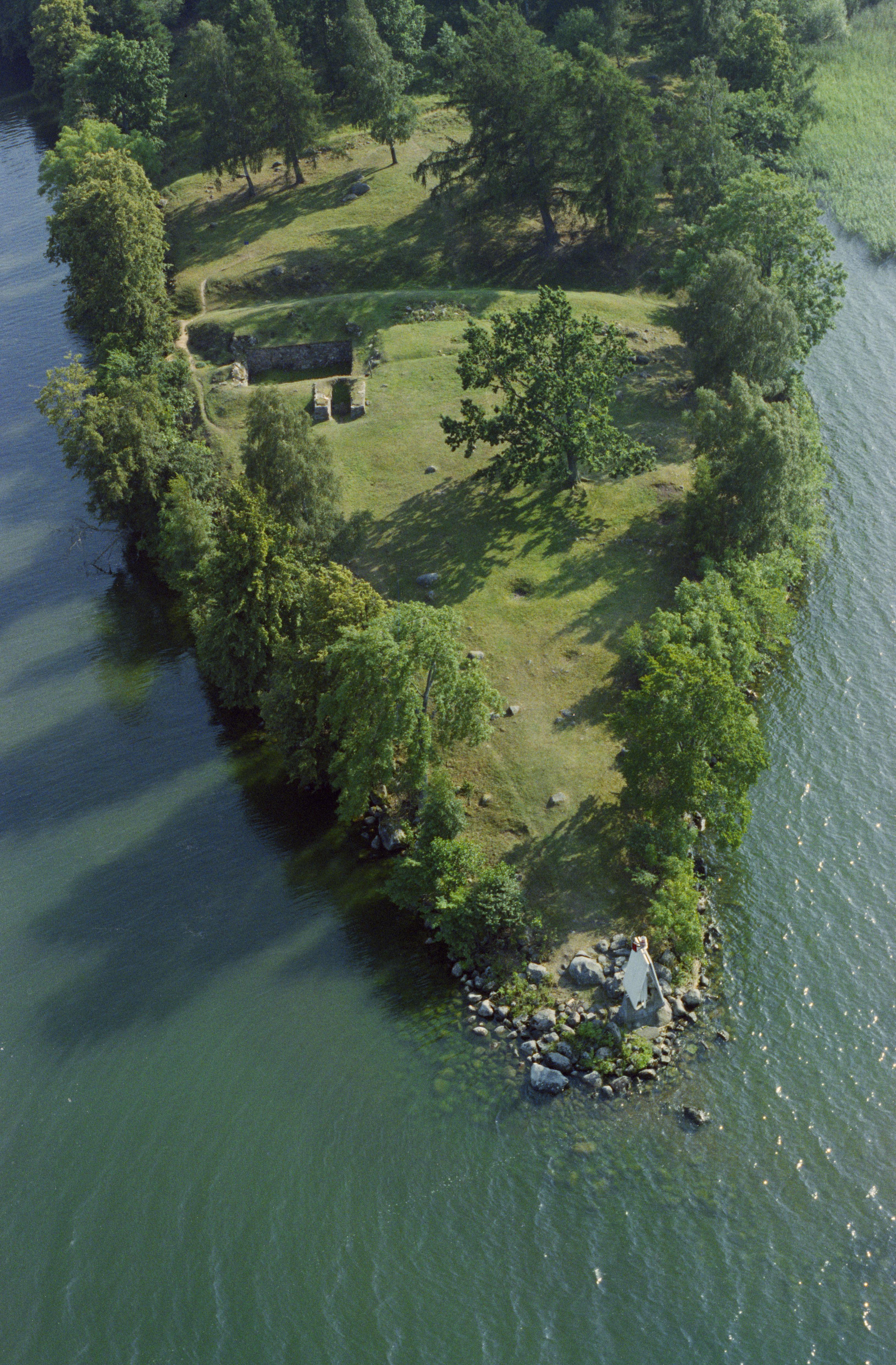 Borgområde med lämningar efter en borg och två husgrunder efter den Heliga Birgitta bostad RAÄnr Ekebyborna 29:1 på en udde vid sjön Boren. Bilden är tagen mot (väderstreck): SSV