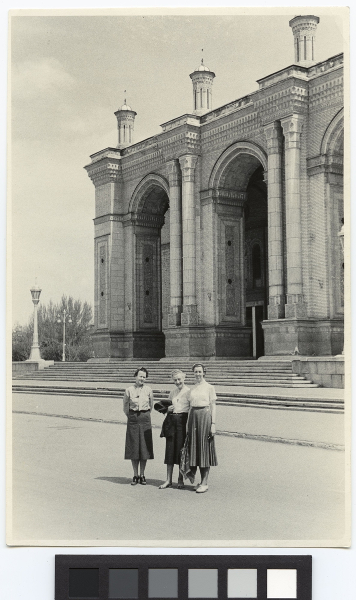 Okänd kvinna, Andrea Andreen och Hillevi Svedberg framför Operan i Tasjkent, ritad av Aleksej Sjtjusev