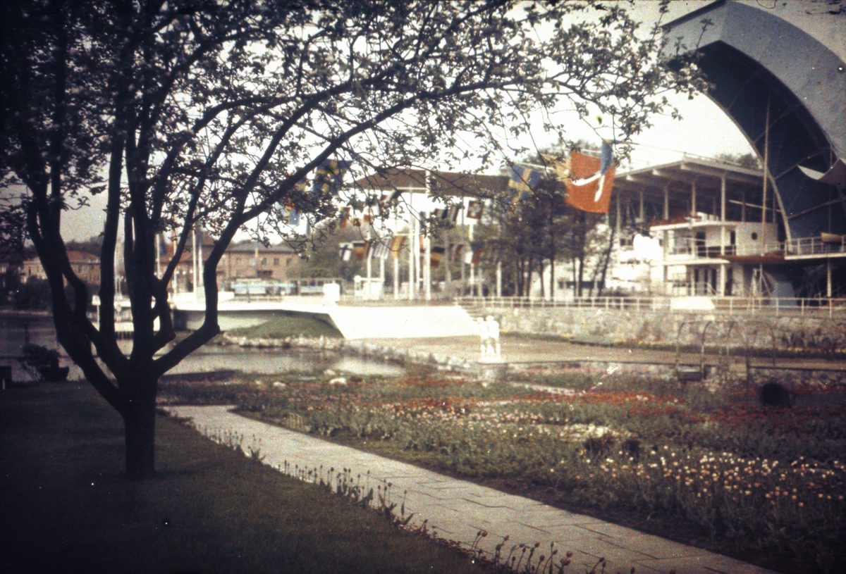 Blomsterplanteringar, entrén och samfärdsel i bakgrunden