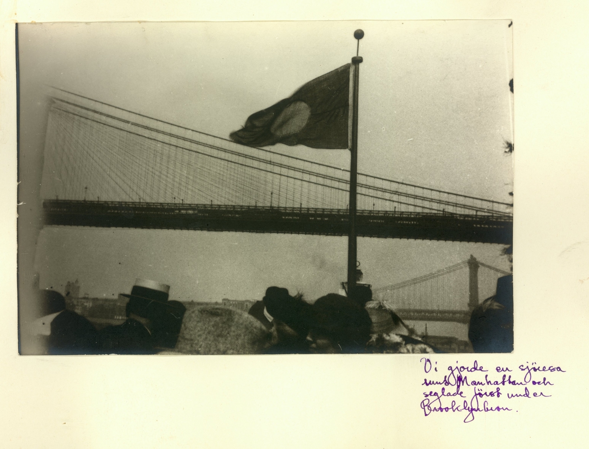 Båtresa runt Manhattan. Människor och detalj av bro. Flagga. Resebilder ur Gunnar Asplunds samling.
