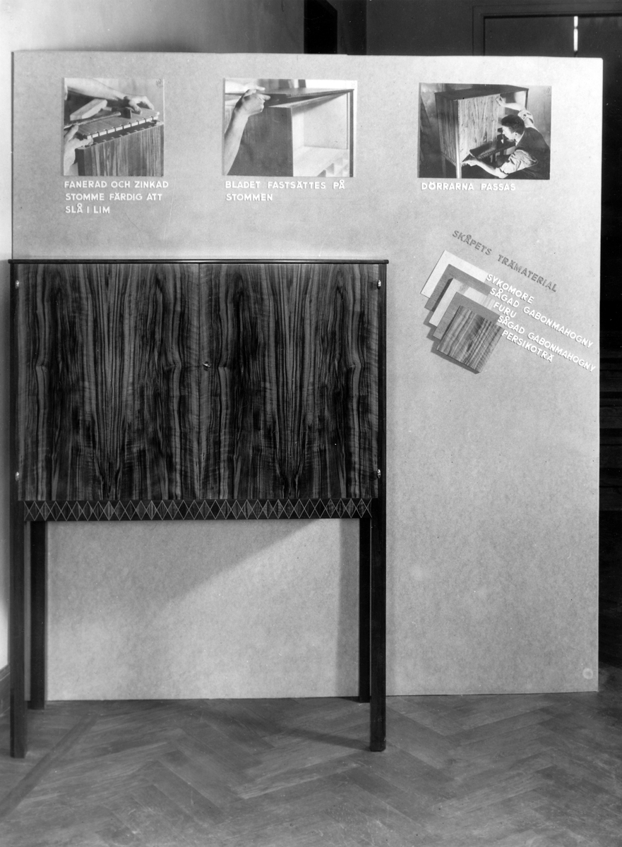 Inredning. Hantverkslotteriets tävling. Skåp utvändigt persikoträ, invändigt cycomore