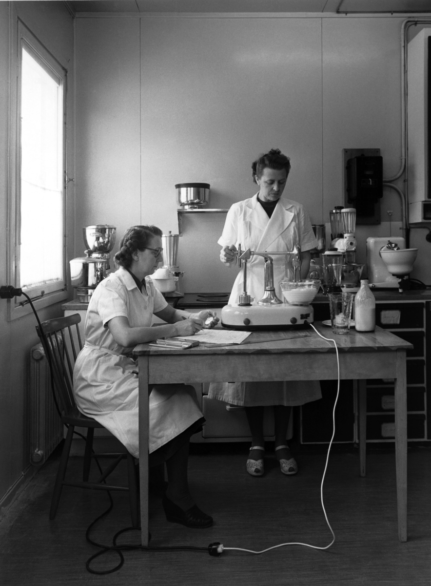 Interiör med två kvinnor vid provtagning av köksmaskin.