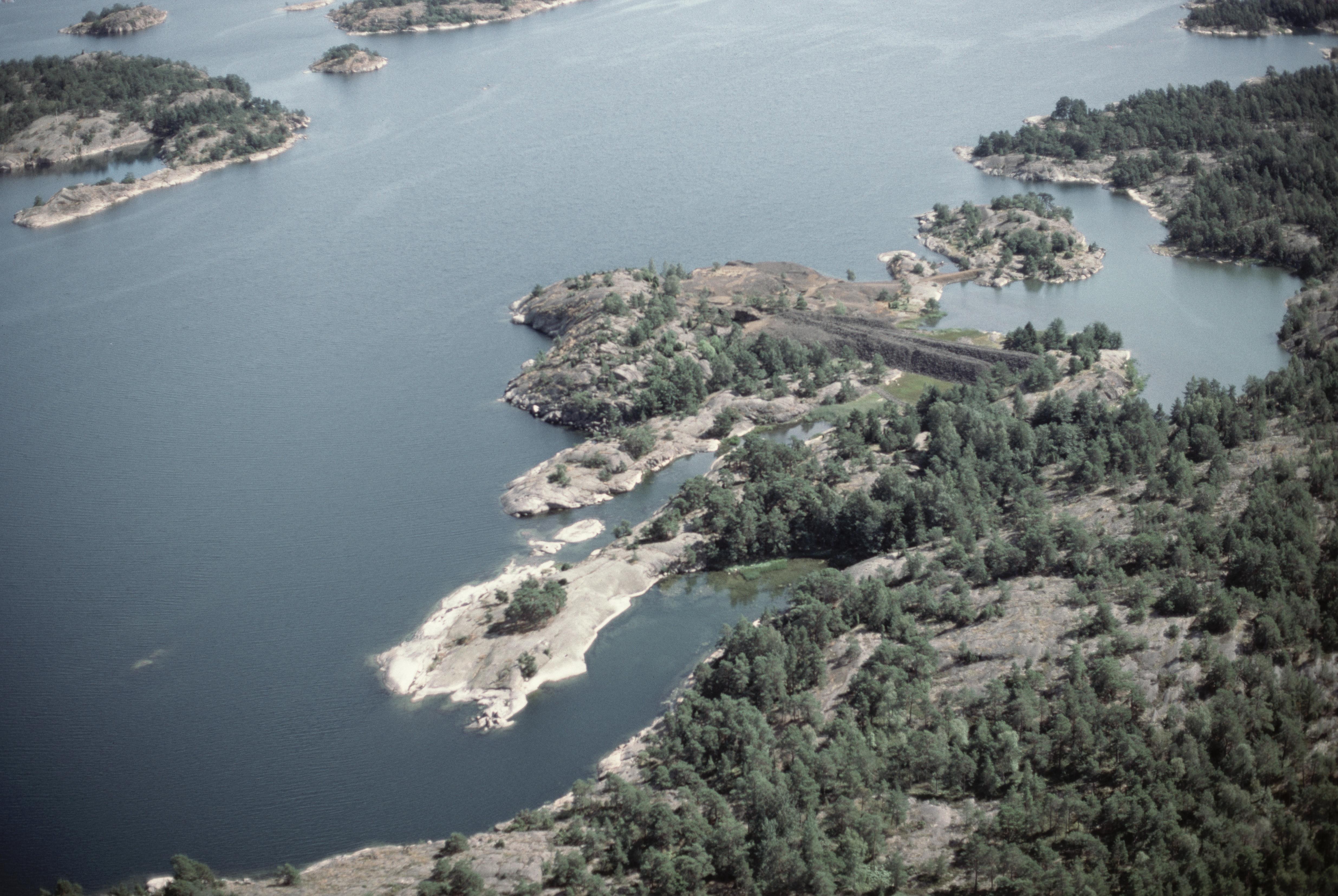Gryts skärgård. Ön Fångö, norrostra delen. Vid bildens mitt Fångö gruva RAÄnr Gryt 186:1 på Gruvholmen. I bildens övre del Gubbön i Gryts naturreservat. Bilden är tagen mot (väderstreck): SO