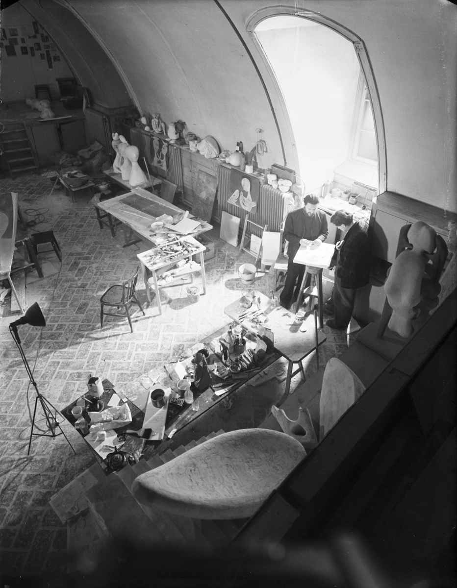 Titel: Egon Möller-Nielsen och Ralph Erskine i Möller Nielsens ateljé. Interiör