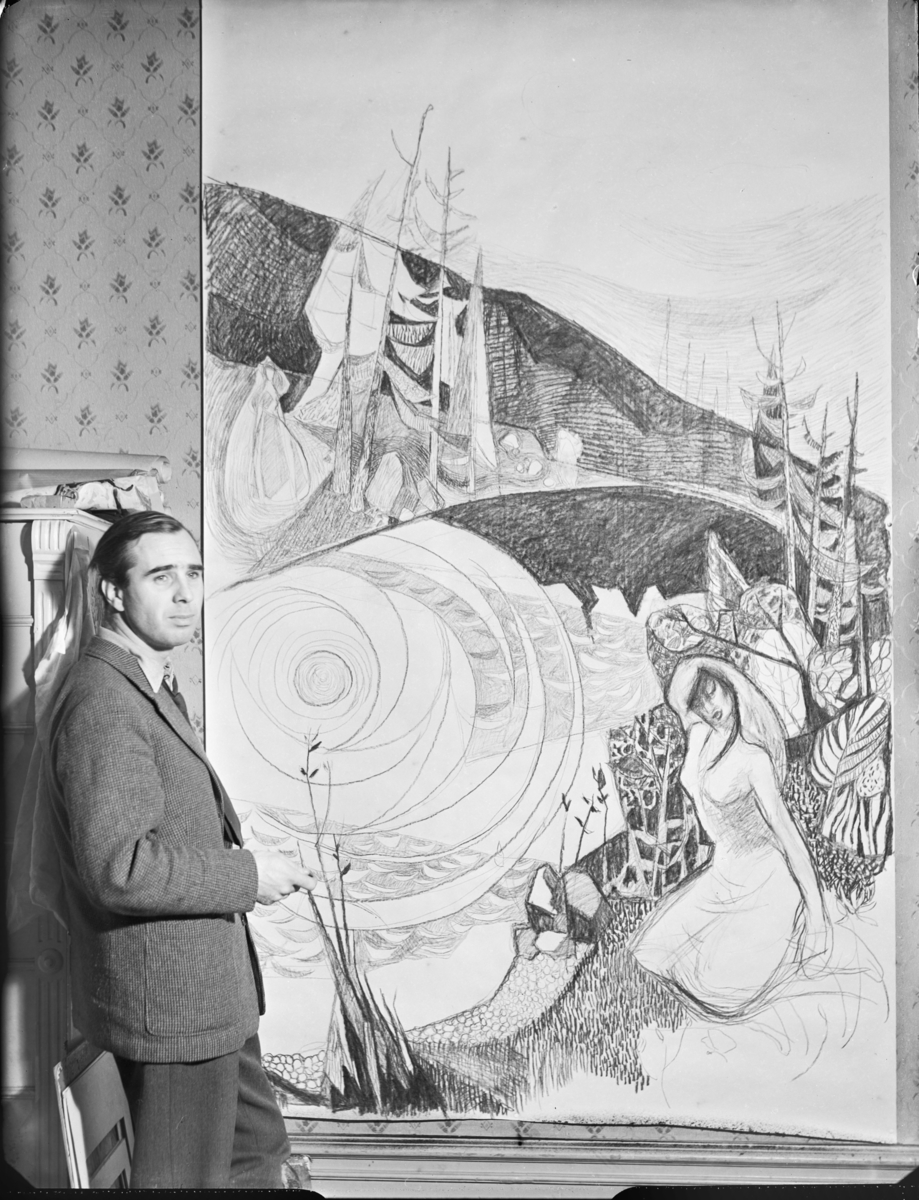Porträtt av konstnären Armand Rossander bredvid en av hans tavlor