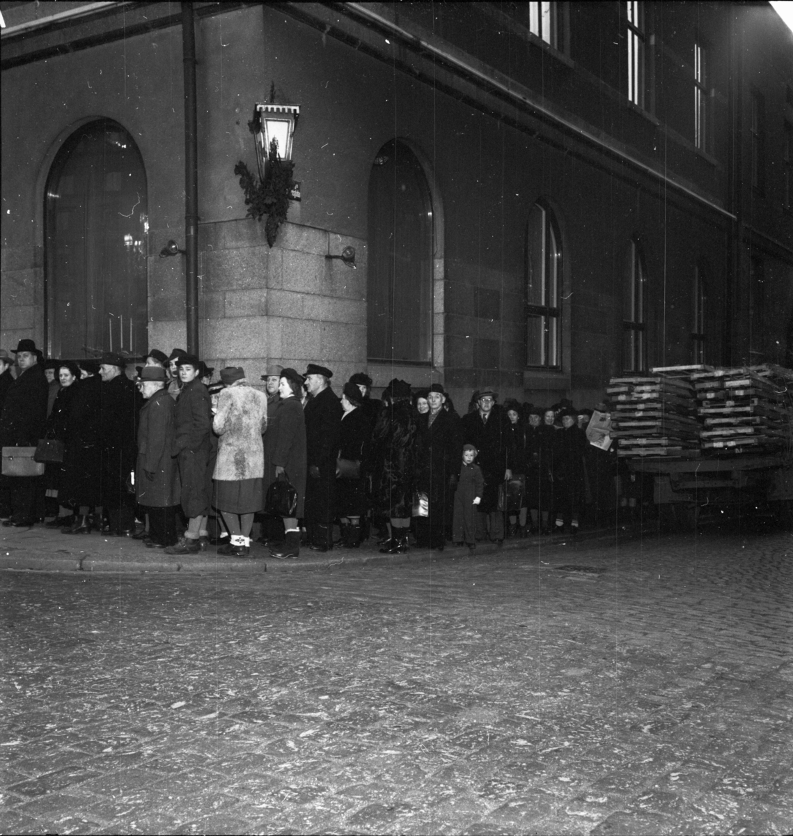 Titel: Kö vid Hantverkslotteriet på Vattugatan upp mot Brunkebergstorg. Exteriör