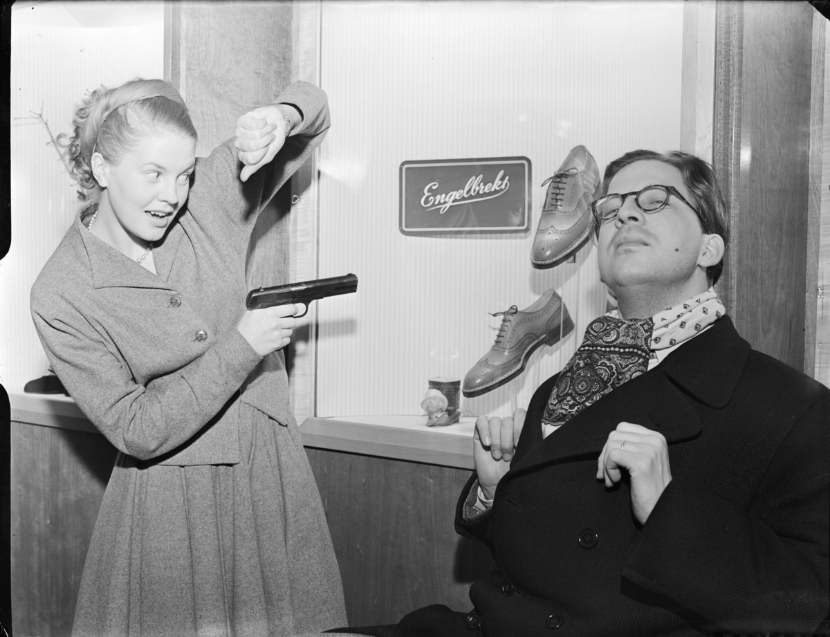 Monter för skomärket Engelbrekt och framför den en tablå med modellen Aare, en man och en pistol