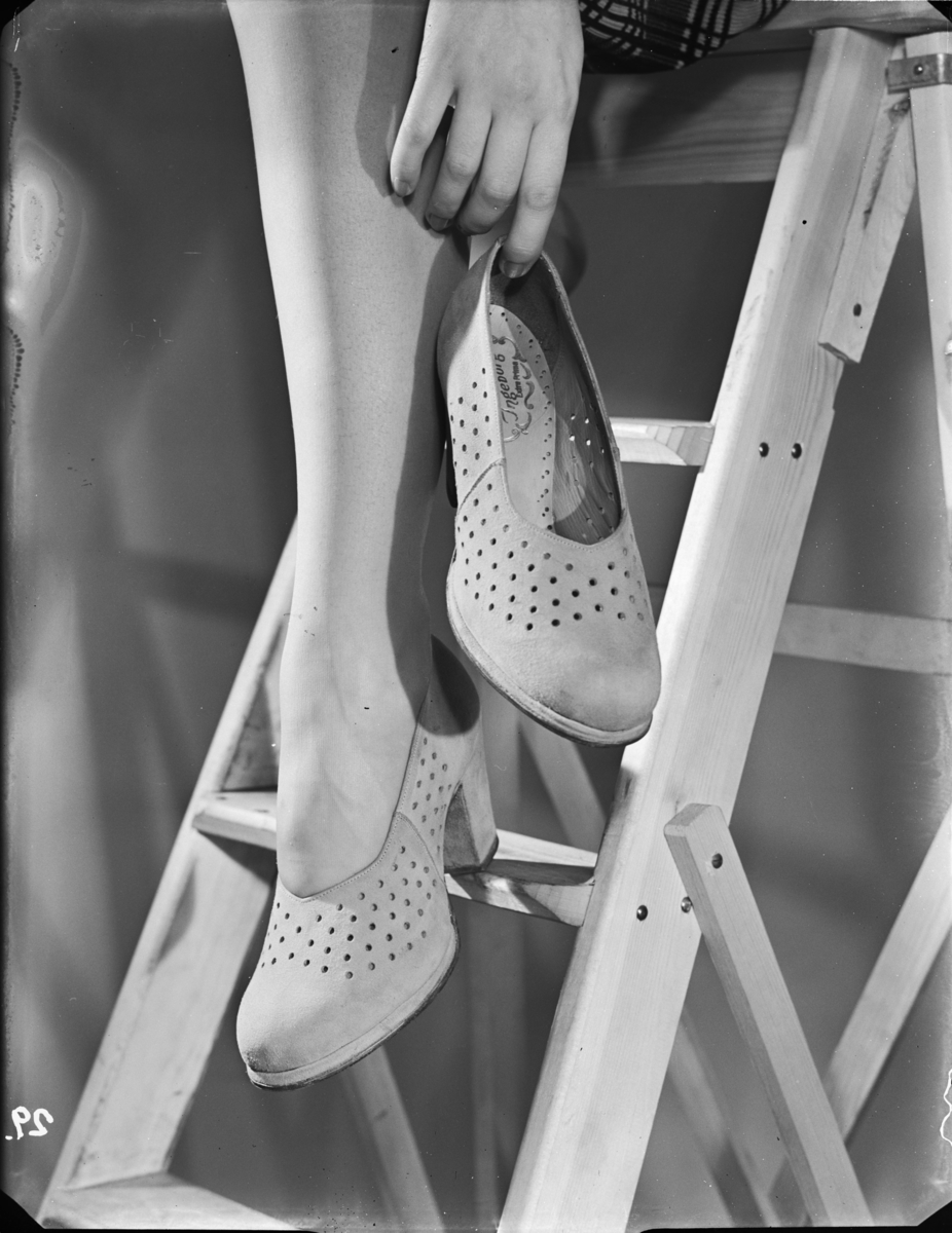 Kvinna stående på en stege med en sko på foten och en i handen