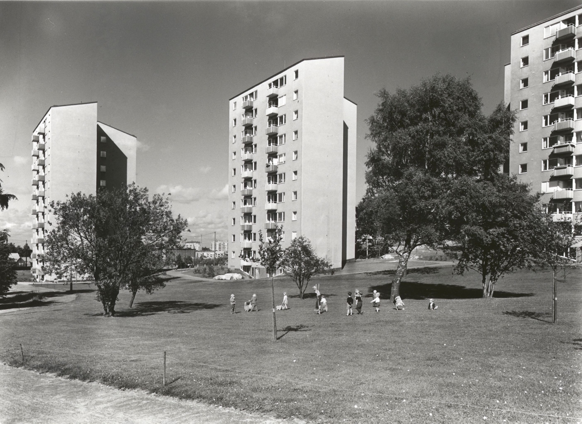 Exteriör, Södra Guldheden. Lekande barn i förgrunden. Tre punkthus av nio