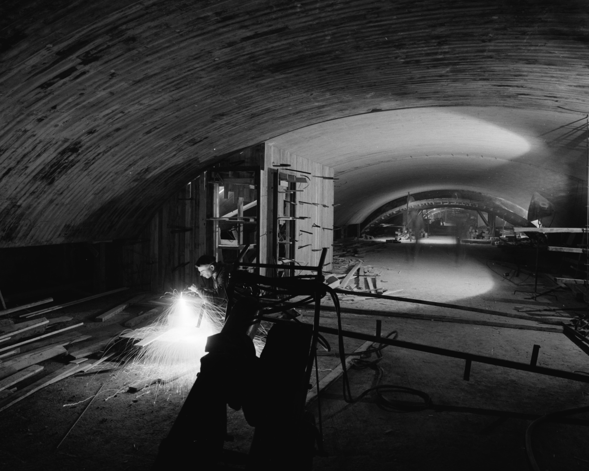 Interiör av garage, byggarbetsplats med form för valv