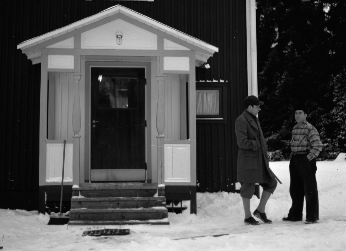 Exteriör, detalj av fasad med förstukvist och två samtalande herrar.