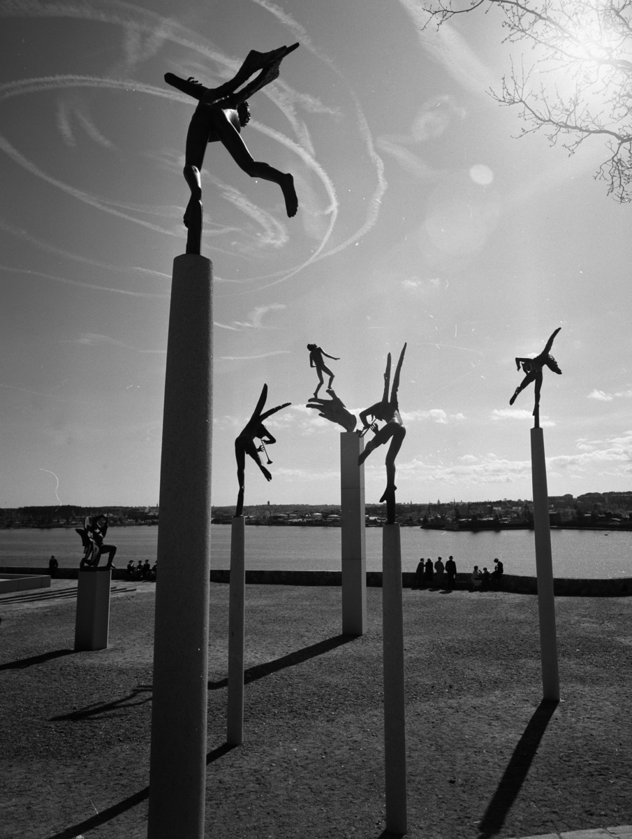 Miljöbild, skulpturparken. Nedre terrassen med skulpturer, bland annat Musicerande änglar, på höga socklar som avtecknar sig som silhuetter mot himlen.