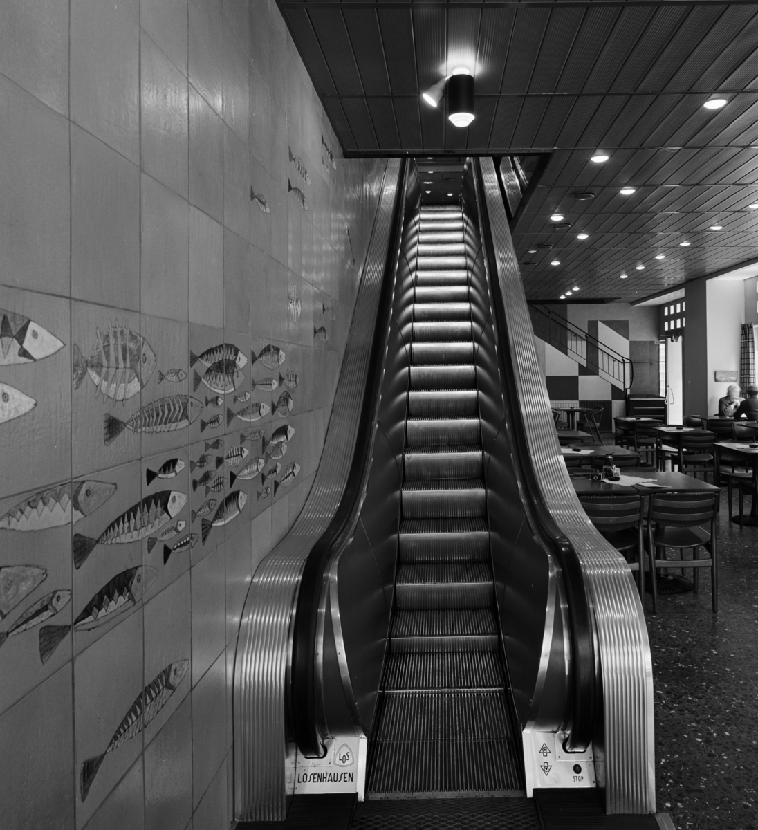Interiör, rulltrappa vid dekorativt smyckad vägg med fiskmotiv