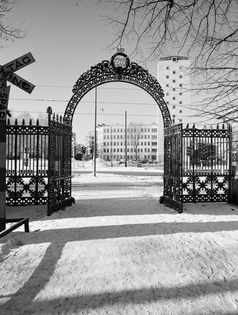 Exteriör, höghus i vinkel med lägre hus, sett genom Haga norra grindar. I vinterlandskap.
