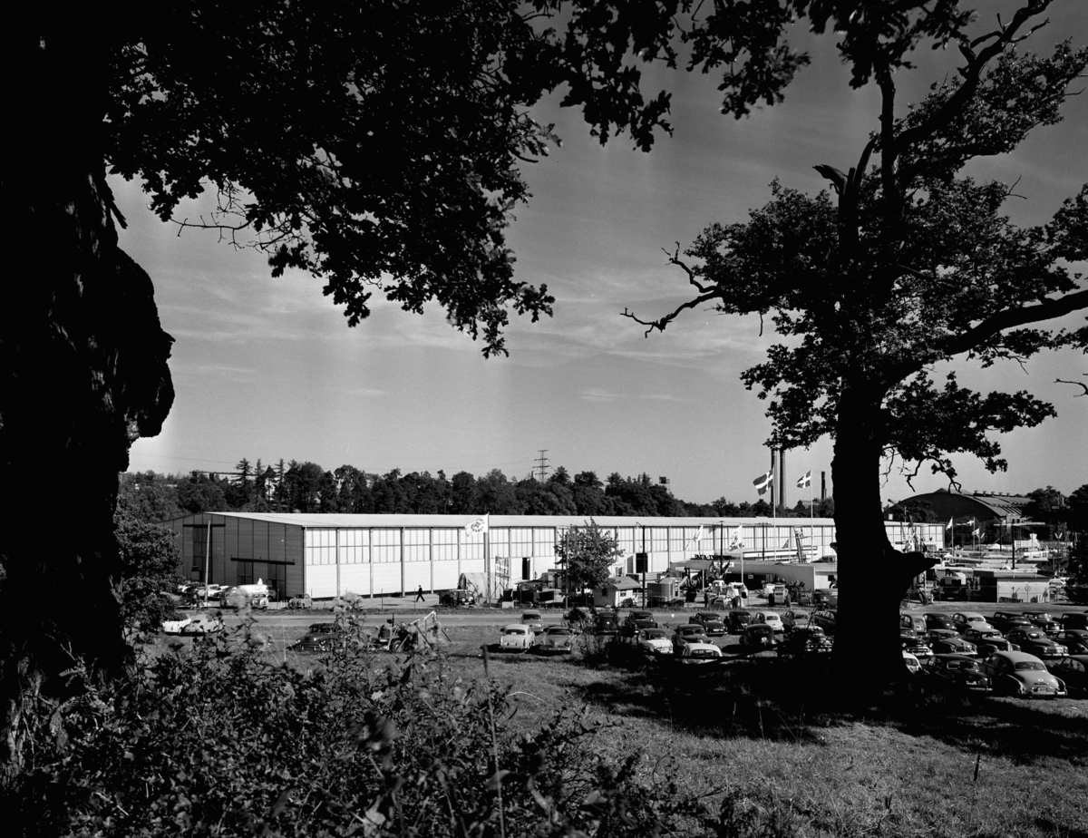 Exteriör, utställningshall sedd från distans med beskuggande träd i förgrunden